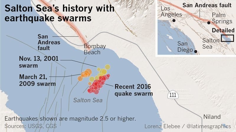 Στις 26 Σεπτεμβρίου 2016, μια γρήγορη διαδοχή μικρών σεισμών – ο ισχυρότερος μετρήθηκε πάνω από το μέγεθος 4,0 ρίχτερ – άρχισε να διασπάται κάτω από τη θάλασσα του Salton κοντά στο ρήγμα του San Andreas. Οι επιστήμονες ανησυχούσαν ότι οι σεισμοί θα μπορούσαν να προκαλέσουν ένα φαινόμενο ντόμινο, αναζωπύρωση του νότιου San Andreas από τον μακρύ ύπνο του. Αυτό το σφάλμα μπορεί να προκαλέσει σεισμό μεγέθους 8.2 ρίχτερ.