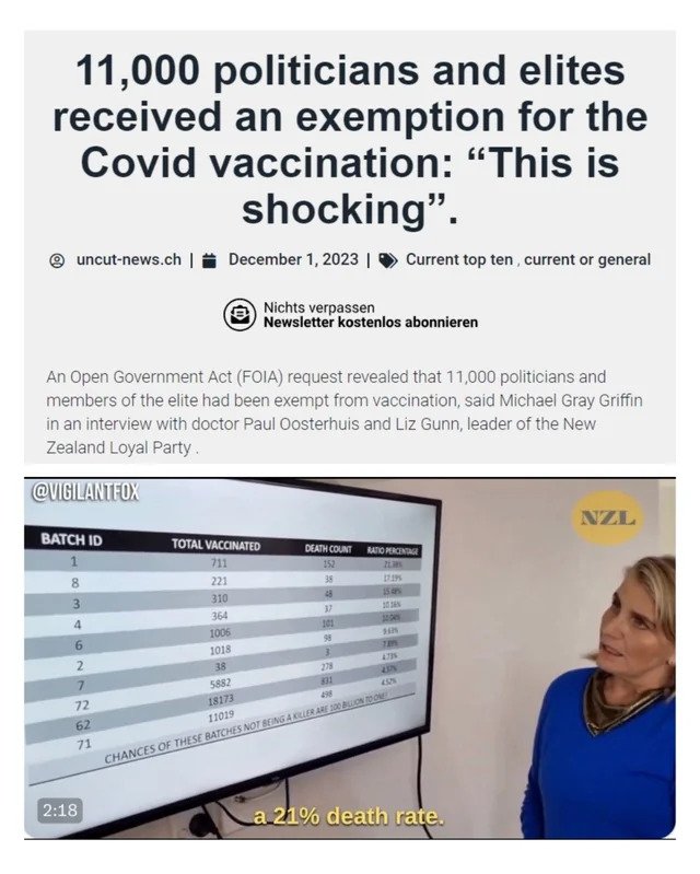 Πληροφοριοδότης απο τη Νέα Ζηλανδία αποκαλύπτει ότι 11.000 πολιτικοί και η ελίτ έλαβαν εξαιρέσεις από το εμβόλιο, ο πληροφοριοδότης επιβεβαίωσε επίσης την ύπαρξη «καυτών παρτίδων» ή «κακών παρτίδων»