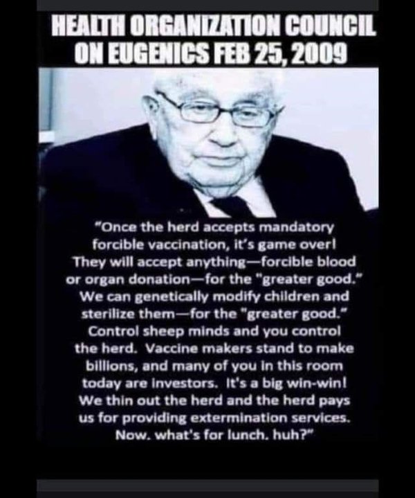 Αν δεχτείτε το υποχρεωτικό εμβόλιο ή εμβόλια, και ο Σατανάς Κίσινγκερ το γνωρίζει απόλυτα, τα κατοικίδια τους στην συνέχεια θα υποχρεωθούν να αλλάζουν ή να δέχονται όργανα, υποχρεωτική αιμοδωσία γιατί το κράτος της ανομίας είναι ο ιδιοκτήτης και θα έχει περάσει όλους τους νόμους (ΚΑΙ) εναντίον της σωματικής σας υπόστασης…που να γνωρίζατε με ποιους έχετε να κάνετε!!!