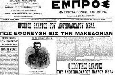 Εκατόν δεκατέσσερα χρόνια συμπληρώνονται από τον θάνατο του Παύλου Μελά. Λίγο έως πολύ όλοι γνωρίζουμε τον πατριωτισμό και τη θυσία του για να εξασφαλισθεί η ελληνικότητα της Μακεδονίας. Ένας νεαρός και ενθουσιώδης αξιωματικός που εγκατέλειψε την ηρεμία της υπηρεσίας και τη γαλήνη ενός μεγαλοαστικού αθηναϊκού σπιτιού για να πιάσει το καριοφίλι και κάτω από την προστασία μιας μάλλινης κάπας να πρωταγωνιστήσει σ’ έναν εντελώς αβέβαιο αγώνα.
