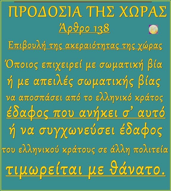 Για την προδοσία της χώρας υπάρχει σχετικό άρθρο….άρα κάποιοι θα έπρεπε να τιμωρηθούν όπως αρμόζει το ελληνικό Σύνταγμα! Ή δεν υπάρχει πλέον Ελλάδα και Σύνταγμα;;;