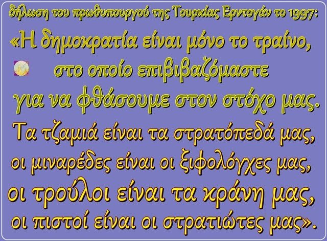 Δήλωση Ερντογαν το 1997: η δημοκρατία είναι μόνο το τραίνο στο οποίο επιβιβαζόμαστε…για να φθάσουμε τον στόχο μας.