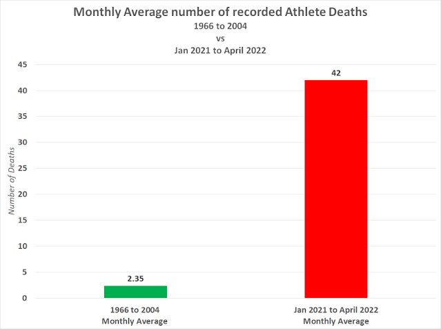 Μια έρευνα επίσημων στατιστικών διαπίστωσε ότι ο αριθμός των αθλητών που πέθαναν από τις αρχές του 2021 έχει αυξηθεί εκθετικά σε σύγκριση με τον ετήσιο αριθμό θανάτων αθλητών που καταγράφηκαν επίσημα μεταξύ 1966 και 2004.