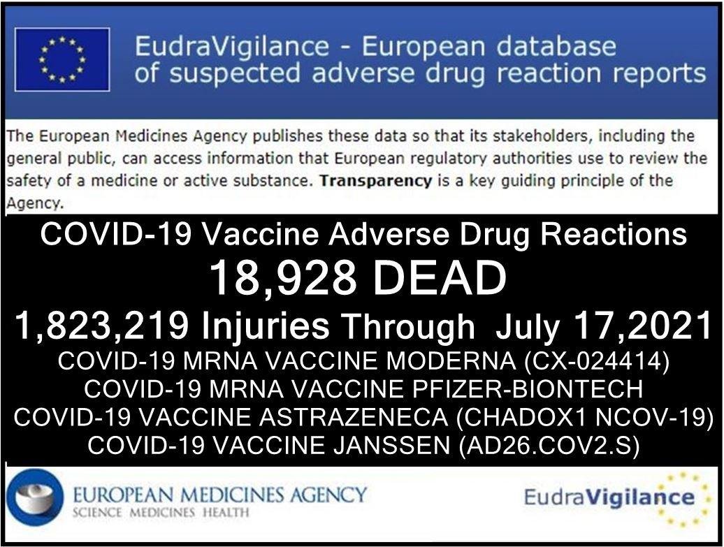 Η βάση δεδομένων της Ευρωπαϊκής Ένωσης για τις ύποπτες αναφορές αντιδράσεων φαρμάκων είναι το EudraVigilance και τώρα αναφέρουν 18.928 θανάτους και 1.823.219 τραυματισμούς, μετά από τις ενέσεις COVID-19.