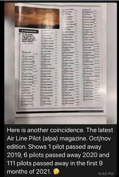 Φαίνεται ότι οι πιλότοι προσπαθούν να μας διδάξουν κάτι για την ασφάλεια των εμβολίων. Έχουμε μια ομάδα 40 ατόμων που εξετάζει όλα τα πίσω τεύχη του περιοδικού και ερευνά όλους τους θανάτους. Μείνετε συντονισμένοι για το τι βρίσκουν.