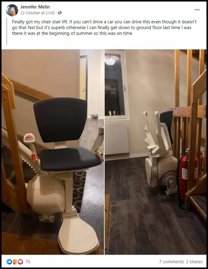 Ωστόσο, σε μια θετική εξέλιξη, ο δήμος συμφώνησε να βοηθήσει στην κατάστασή της προσαρμόζοντας το διαμέρισμά της στις ανάγκες της. Κατασκεύασαν έναν ανελκυστήρα που της επιτρέπει να ανεβαίνει και να κατεβαίνει τις σκάλες μεταξύ του ισογείου και του δωματίου της.