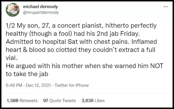 Ένας Βρετανός πιανίστας αντιμετώπισε σοβαρά προβλήματα υγείας λίγο μετά τη δεύτερη δόση της ένεσης για τον COVID-19. Ο Phillip Leslie, 27 ετών, έκανε την ένεση την Παρασκευή 10 Δεκεμβρίου και αμέσως ένιωσε πόνους στο στήθος. Εισήχθη στο νοσοκομείο την επόμενη μέρα και διαγνώστηκε με φλεγμονή στην καρδιά και θρόμβους αίματος.