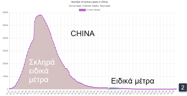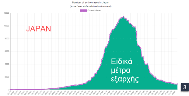 Mε το lockdown o μέγιστος αριθμός των παρόντων ασθενών έφτασε τους 1860. Ο Μητσοτάκης αντί να περιμένει την παραπάνω καμπύλη να φτάσει στο “έδαφος” όπως έκανε η Κίνα [εικ. 2], αποφάσισε να ανοίξει τα μέτρα (πράσινη περιοχή στην εικ.1). Στη συνέχεια βλέπετε την ίδια καμπύλη που αφορά την Κίνα και την Ιαπωνία [εικ.3].