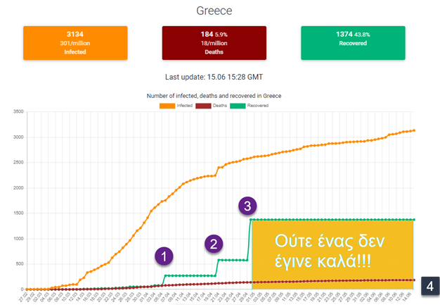 Eπι 45 ημέρες δεν έγινε κανένας καλά ασθενής στην Ελλάδα [εικ. 4]. Μοναδικό φαινόμενο διεθνώς. Τυχαίο όμως; Aληθινό ή παραμύθι; Αληθινό δεν είναι. Είναι αδιανόητο τις τελευταίες 45 ημέρες να μην έγινε καλά ούτε ένας ασθνεής! Εντύπωση προκαλεί επίσης πως την ημέρα (1) στην Ελλάδα έγιναν καλά ξαφνικά 100 ασθενείς, την ημέρα (2) 200 ασθενείς και την ημέρα (3) 500 ασθενείς [εικ. 4]. Τα δεδομένα όλα βασίζονται στα δεδομένα που η κυβέρνηση στέλνει στο παν/μιο John Hopkins, USA.