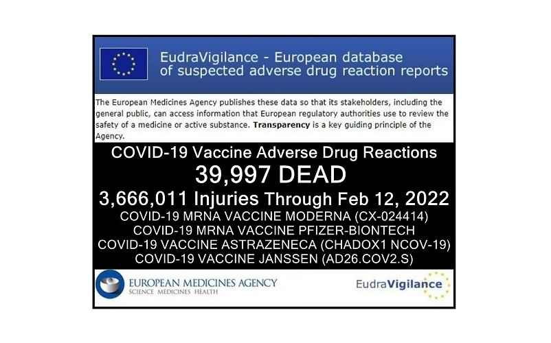 Η ευρωπαϊκή βάση δεδομένων (χώρες του ΕΟΧ και εκτός του ΕΟΧ) των αναφορών ύποπτων αντιδράσεων σε φάρμακα είναι η EudraVigilance, η οποία ελέγχεται από τον Ευρωπαϊκό Οργανισμό Φαρμάκων (EMA), και τώρα αναφέρει 39.997 θανάτους και 3.666.011 τραυματισμούς μετά από ενέσεις τεσσάρων πειραματικών ενέσεων COVID-19: