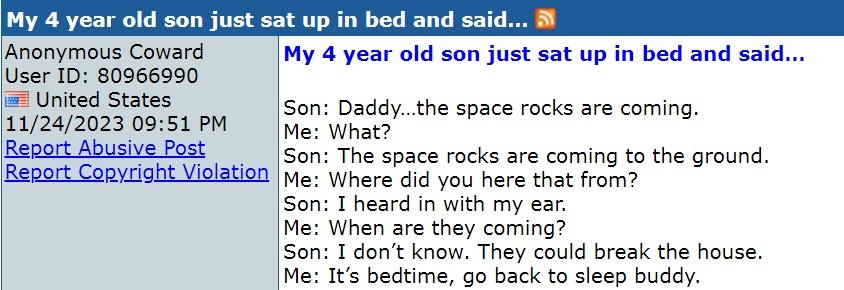 Ο 4χρονος γιος μου ξύπνησε σήμερα το πρωί, κάθισε στο κρεβάτι και είπε: Μπαμπά… έρχονται οι διαστημικοί βράχοι.