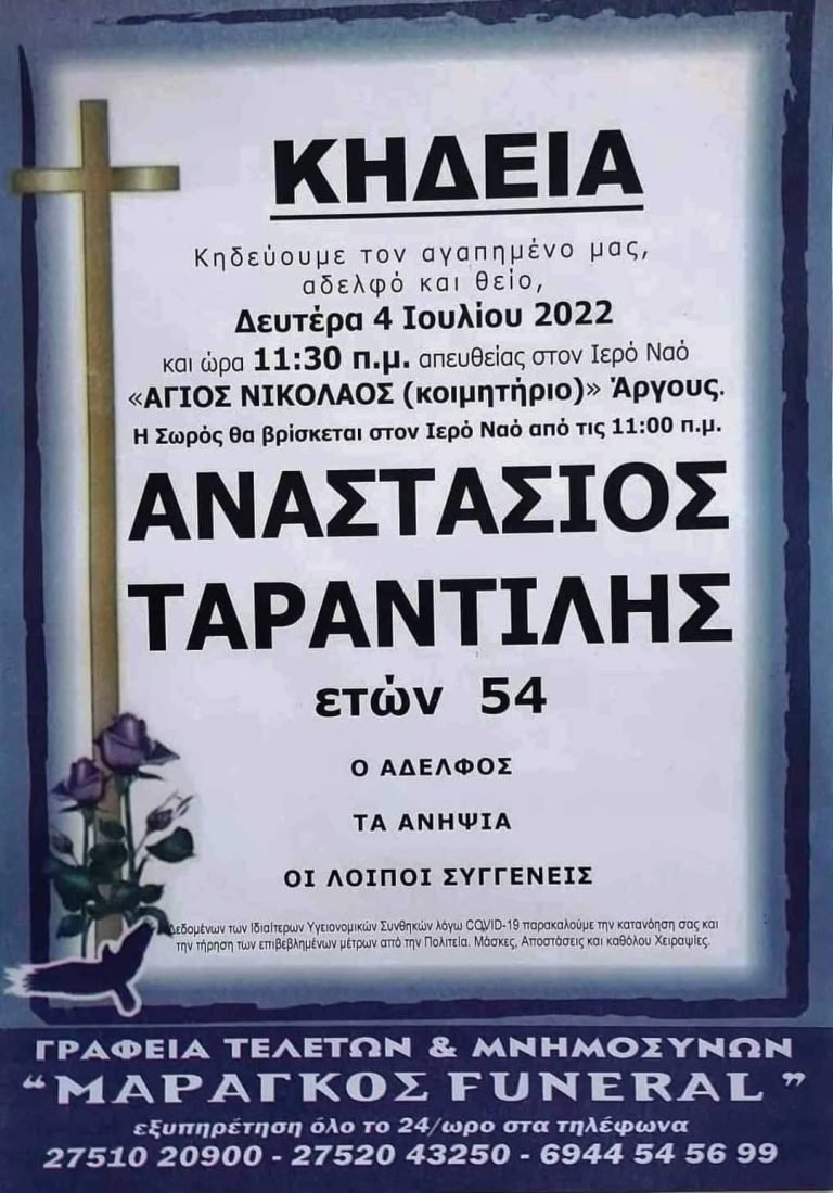 Έφυγε από τη ζωή το μεσημέρι του Σαββάτου 2 Ιουλίου, σε ηλικία 54 ετών, ο Αργείτης Τάσος Ταραντίλης, έπειτα από νοσηλεία στο νοσοκομείο Άργους.