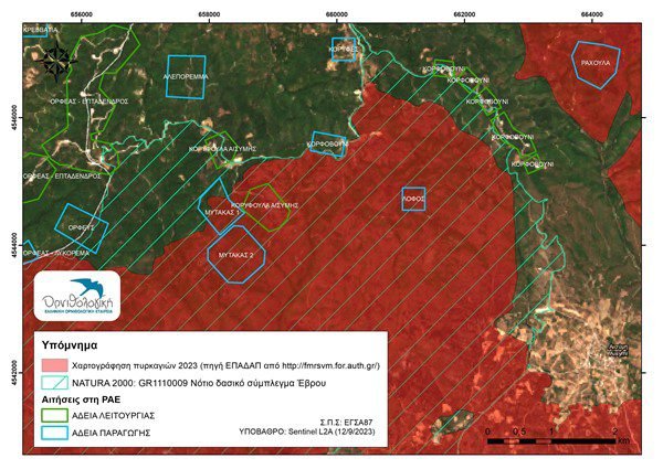 Σε λιγότερο από 20 ημέρες από τη στιγμή που έσβησε η τεράστια σε καταστροφικές συνέπειες πυρκαγιά του Έβρου, της μεγαλύτερης σε έκταση που συνέβη ποτέ σε χώρα της Ευρωπαϊκής Ένωσης, η Αποκεντρωμένη Διοίκηση Μακεδονίας – Θράκης (ΑΔΜ-Θ) προχώρησε πριν λίγες ημέρες (20/09) στην αδειοδότηση Αιολικού Σταθμού (ΑΣΠΗΕ) εντός της καμένης έκτασης και μέσα στην περιοχή NATURA (Ζώνη Ειδικής Προστασίας, ΖΕΠ) GR1110009 «Νότιο Δασικό Σύμπλεγμα Έβρου»!