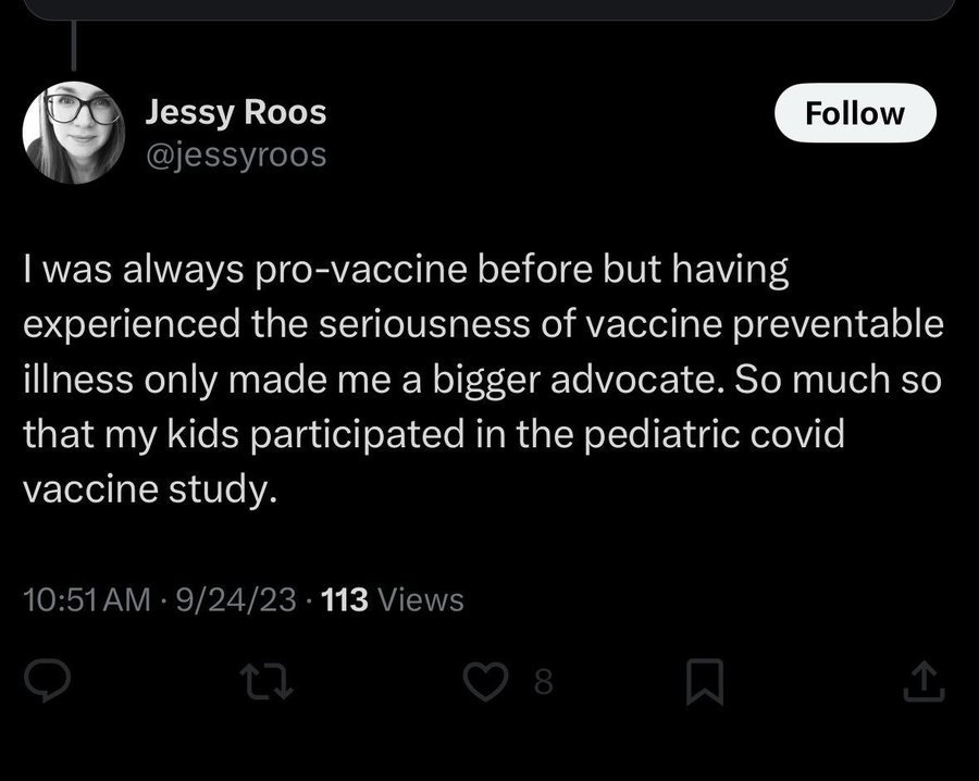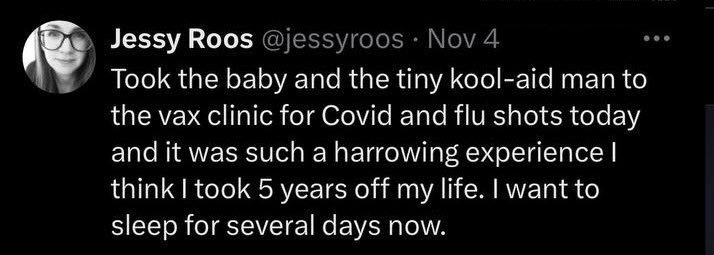 4 Νοεμβρίου 2024: «Πήρα το μωρό και τον μικροσκοπικό ανθρωπάκι στην κλινική vax για εμβόλια για τον Covid και τη γρίπη σήμερα και ήταν μια τόσο οδυνηρή εμπειρία που νομίζω ότι έκοψα 5 χρόνια από τη ζωή μου. Θέλω να κοιμηθώ αρκετές μέρες τώρα».