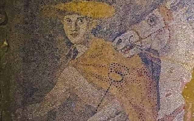 Τμήμα από το ψηφιδωτό δαπέδου του του δεύτερου χώρου του αρχαίου ταφικού κτίσματος στην Αμφίπολη. Θεωρείται ότι η φιγούρα απεικονίζει τον Ερμή και φοράει στο κεφάλι Πέτασο ή Καυσία.