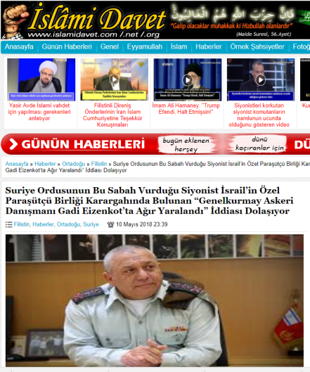 »Aνεπιβεβαίωτες αναφορές φέρουν τον ισραηλινό αρχηγό ΓΕΣ Gadi Eizenkot να τραυματίστηκε άσχημα από συριακούς πυραύλους που κατέστρεψαν το κύριο διοικητήριο του Ισραηλινού στρατού στο Golan την τελευταία νύχτα! To Iσραήλ δεν επιβεβαιώνει ούτε διαψεύδει αυτές τις αναφορές ». Η είδηση μεταφέρεται τώρα από το δραστήριο και γνωστό βουλευτή Χαλεπίου Fares Shehambi.