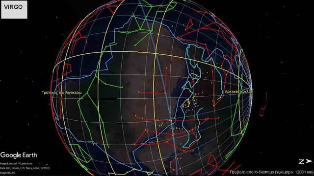 Διακρίνουμε αυτούς στο κέντρο (με πράσινο), που είναι η τροχιά του ηλίου, ο ζωδιακός κύκλος.