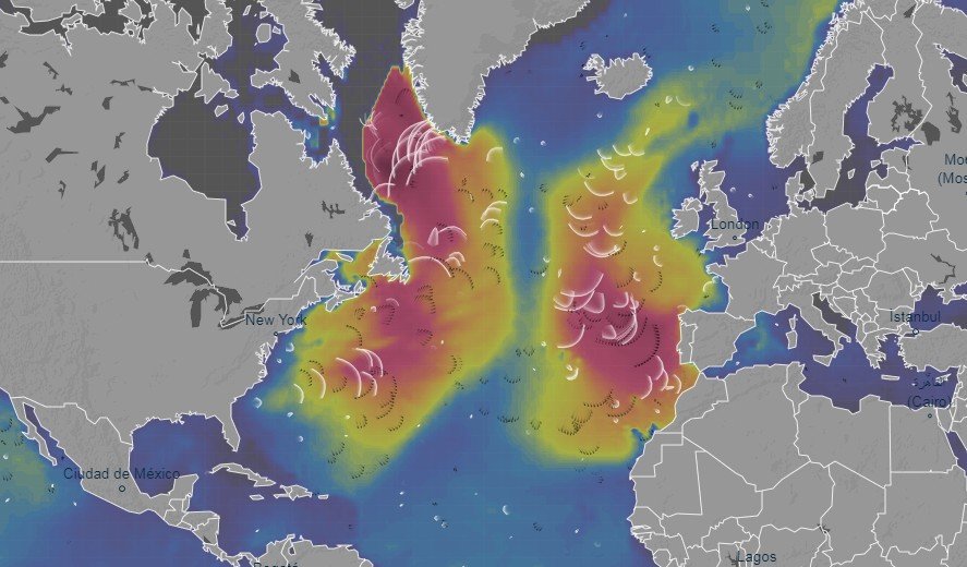 Η Νάνσυ είναι περήφανη ιδιοκτήτρια του ventusky.com premium, επομένως όλα στην ταινία της είναι λίγο πιο όμορφα και λίγο πιο λεπτομερή, αλλά δεν αλλάζουν την ουσία: στον Βόρειο Ατλαντικό υπάρχει μια ήρεμη λωρίδα ακριβώς κατά μήκος της Mid-Atlantic Ridge.