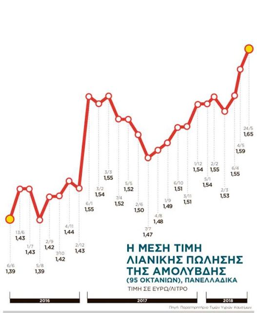 Ενδεικτικά, η μέση τιμή λιανικής της απλής αμόλυβδης βενζίνης 95 οκτανίων για την Παρασκευή 18/05/2018 διαμορφώθηκε στα 1,640 ευρώ ανά λίτρο. Σε σχέση με την τιμή της προηγούμενης βδομάδας (11/05) σημειώθηκε αύξηση κατά 0,023 ευρώ ανά λίτρο.
