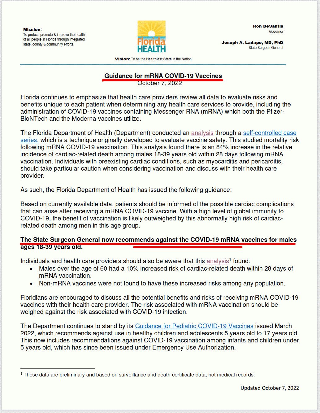 Το Υπουργείο Υγείας της Πολιτείας της Φλόριντα ανακοίνωσε ότι οι άνδρες κάτω των 40 ετών θα πρέπει να αποφεύγουν το εμβόλιο mRNA για τον COVID λόγω του κινδύνου θανάτου που σχετίζεται με την καρδιά!!!