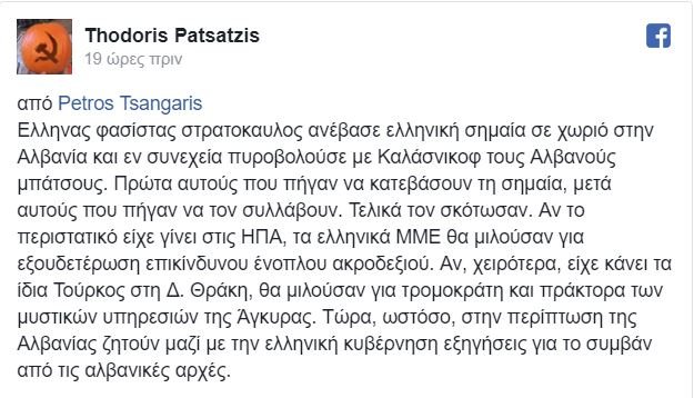 Ελληνας φασίστας στρατοκαυλος ανέβασε ελληνική σημαία σε χωριό στην Αλβανία και εν συνεχεία πυροβολούσε με καλασνικοφ τους Αλβανούς μπάτσους. Πρώτα αυτούς που πήγαν να κατεβάσουν τη σημαία, μετά αυτούς που πήγαν να τον συλλάβουν. Τελικά τον σκότωσαν. Αν το περιστατικό είχε γίνει στις ΗΠΑ, τα ελληνικά ΜΜΕ θα μιλούσαν για εξουδετέρωση επικίνδυνου ένοπλου ακροδεξιού. Αν, χειρότερα, είχε κάνει τα ίδια Τούρκος στη Δ. Θράκη, θα μιλούσαν για τρομοκράτη και πράκτορα των μυστικών υπηρεσιών της Άγκυρας. Τώρα, ωστόσο, στην περίπτωση της Αλβανίας ζητούν μαζί με την ελληνική κυβέρνηση εξηγήσεις για το συμβάν από τις αλβανικές αρχές.