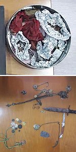 Μέσα στους τέσσερις τοίχους του σπιτιού το «πολυάσχολο» ζευγάρι είχε καταφέρει να κρύβει και έναν πραγματικό αρχαιολογικό θησαυρό. Οι άνδρες της Ασφάλειας Ιωαννίνων κατάσχεσαν, μεταξύ άλλων, τρεις ξύλινες σφραγίδες, νομίσματα ρωμαϊκής, βυζαντινής και οθωμανικής περιόδου, ένα από τα οποία αναπαριστά τον Ρωμαίο αυτοκράτορα Μάρκο Αυρήλιο, μια χάλκινη πόρπη, αρχαία δαχτυλίδια και κοσμήματα, και πλήθος άλλων αρχαίων αντικειμένων.