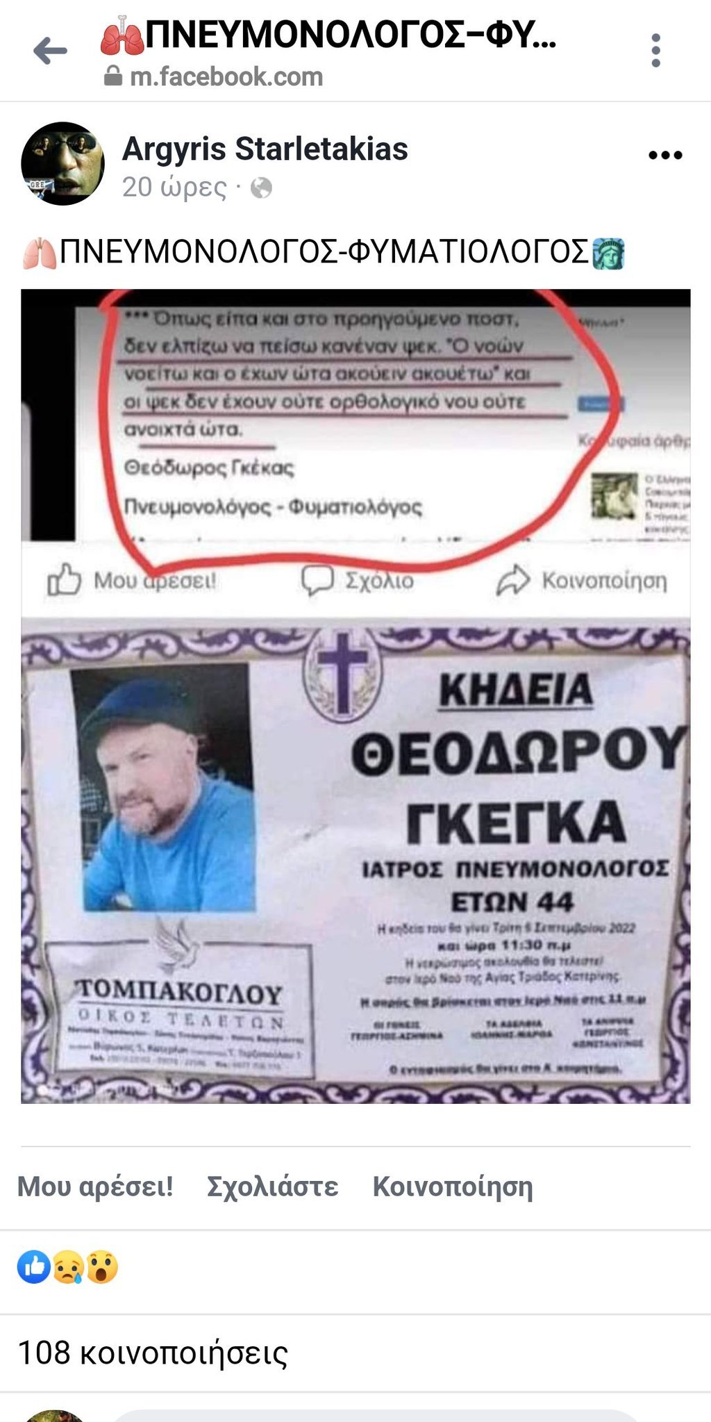 Μπαμ και κάτω!!! Σαράντος Γερογιαννάκης: «Τελείωσα και με τις δύο δόσεις και πήρα την ελευθερία μου, άλλαξα χρώμα στο δέρμα» έγραφε και ειρωνευόταν στο Facebook 19 Νοέ. 2022 Δεν έχουν τελειωμό τα τραγικά μαντάτα στο Ρέθυμνο, καθώς το τελευταίο διάστημα έχουν καταγραφεί αρκετοί αιφνίδιοι θάνατοι νέων ανθρώπων.Το πρωί του Σαββάτου 19 Νοεμβρίου, ένα ακόμη ήρθε … [Read more…]