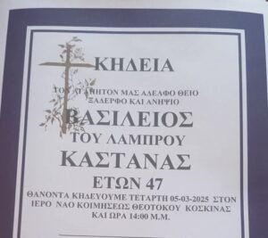 Βαρύ πένθος στο Θέρμο για τον θάνατο του 47χρονου Βασίλη Καστανά 04/03/2025 Με βαθιά θλίψη η τοπική κοινωνία του Θέρμου αποχαιρετά τον Βασίλειο Καστανά του Λάμπρου, ο οποίος έφυγε πρόωρα από τη ζωή σε ηλικία 47 ετών. Η κηδεία του θα πραγματοποιηθεί αύριο, Τετάρτη 5 Μαρτίου 2025, στον Ιερό Ναό Κοιμήσεως Θεοτόκου Κοσκινάς του Δήμου … [Read more…]