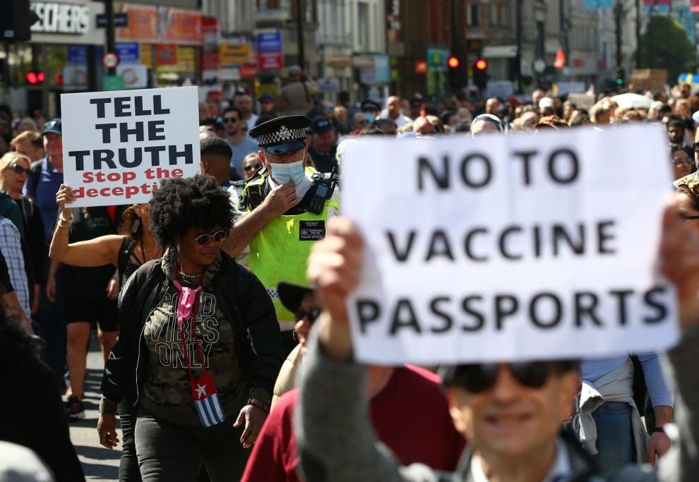 Στο Λονδίνο, η αστυνομία χρησιμοποιεί σκύλους επίθεσης εναντίον μιας ομάδας διαδηλωτών που είναι θυμωμένοι για τη χρήση διαβατηρίων εμβολιασμού: