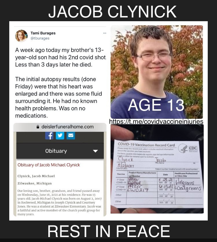 Ο 13χρονος Jacob Clynick ΝΕΚΡΟΣ 3 ημέρες μετά το δεύτερο πειραματικό εμβόλιο της Pfizer COVID