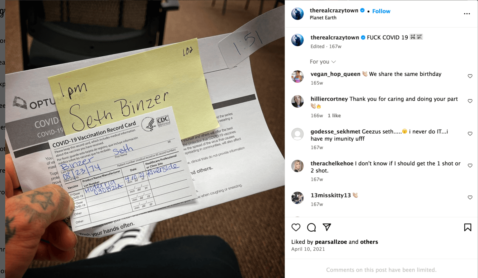 Δύο εμφόλια της Moderna είχε χτυπήσει ο τραγουδιστής των Crazy Town, Seth Binzer, τον Απρίλιο και τον Μάιο του 2021 στον ιατρικό του φάκελο πέθανε ξαφνικά στο Λος Άντζελες