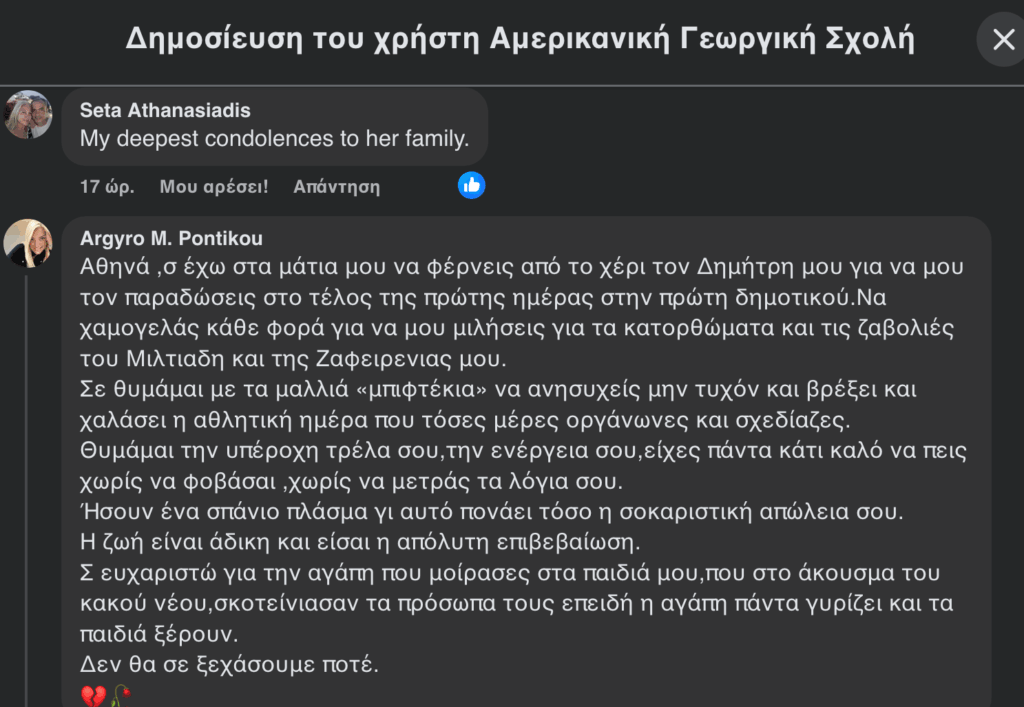 Με βαθιά θλίψη, η οικογένεια της Αμερικανικής Γεωργικής Σχολής ανακοινώνει την απώλεια της Αθηνάς Δημακοπούλου. Για περισσότερα από 10 χρόνια, η Αθηνά διέδωσε τις αρχές και τις αξίες της φυσικής αγωγής σε χιλιάδες μαθητές. Με γενναιοδωρία ψυχής και απεριόριστη ενέργεια, υπήρξε άξια εκπρόσωπος της αποστολής της Σχολής για παροχή ολιστικής εκπαίδευσης. Κυρίως, όμως, υπήρξε πομπός και αποδέκτης αγάπης.