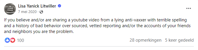 Στις 7 Μαΐου 2020, έγραψε στο Facebook ότι είστε μέρος του προβλήματος αν μοιράζεστε βίντεο στο YouTube με τους «ψεύτες αντι-εμβολιαστές» με «πολύ κακή ορθογραφία» και «ιστορικό κακής συμπεριφοράς».
