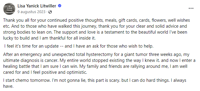 Στις 9 Αυγούστου του περασμένου έτους, έγραψε ότι απροσδόκητα έπρεπε να αφαιρέσει τη μήτρα της αφού διαγνώστηκε με καρκίνο. Αποδείχθηκε ότι υπήρχε ένας «γιγαντιος όγκος».