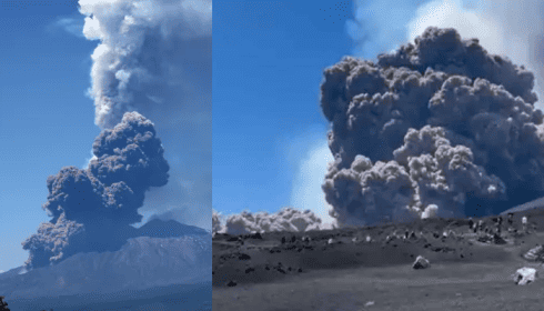 Τα ζωντανά πλάνα δείχνουν ακόμα ένα πανύψηλο σύννεφο πάνω από το ηφαίστειο, παρόλο που η κύρια έκρηξη έχει κοπάσει.