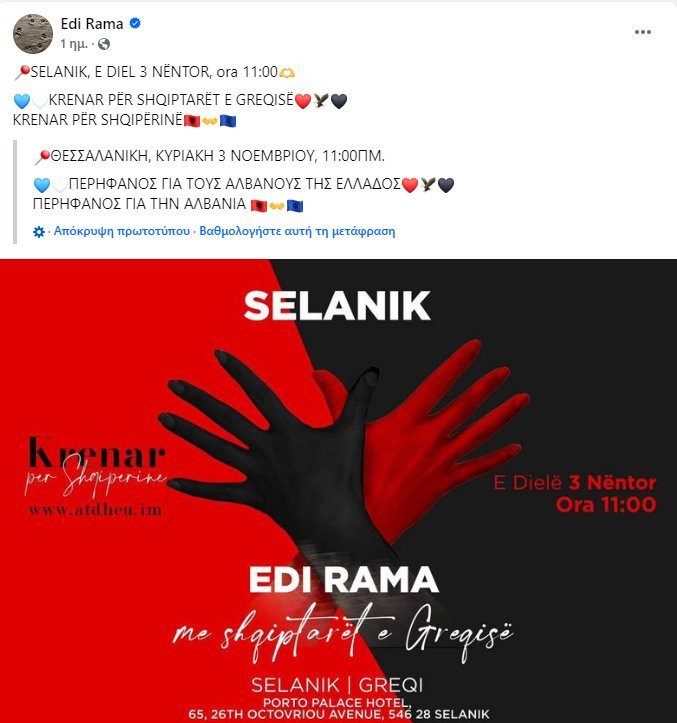 Μέσα σε όλα αυτά , ο γνωστός Ανθέλληνας πρωθυπουργός της Αλβανίας Έντι Ράμα, μετά την νέα προσβολή στην χώρα μας στην συμπεριφορά κατά του Ευρωβουλευτή πλέον Φρέντυ Μπελέρη, ετοιμάζει νέες προκλήσεις στην Θεσσαλονίκη.