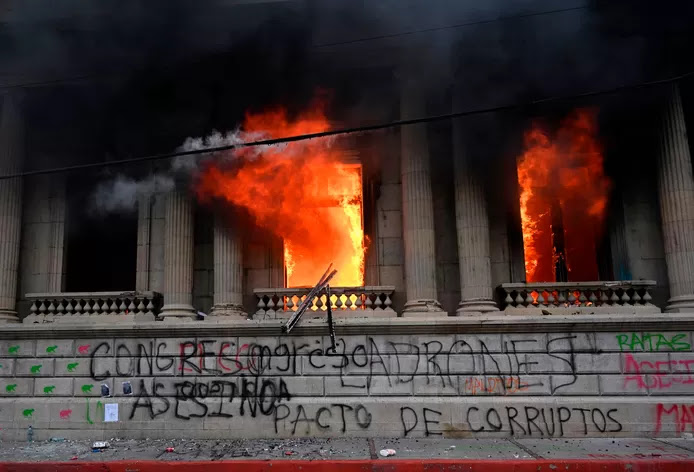 Οι εξοργισμένοι Γουατεμάλα το Σάββατο έβαλαν φωτιά στο κοινοβούλιο της Γουατεμάλας διαμαρτυρόμενοι για τον Πρόεδρο Αλεχάντρο Τζιαμάττεϊ και τον προϋπολογισμό της κυβέρνησής του για το 2021. Ο Ερυθρός Σταυρός της χώρας της Κεντρικής Αμερικής αντιμετώπισε ανθρώπους ζαλισμένους από τα καπνογόνα, δήλωσε εκπρόσωπος της οργάνωσης. Αρκετοί άνθρωποι τραυματίστηκαν μετά από συγκρούσεις με την αστυνομία.