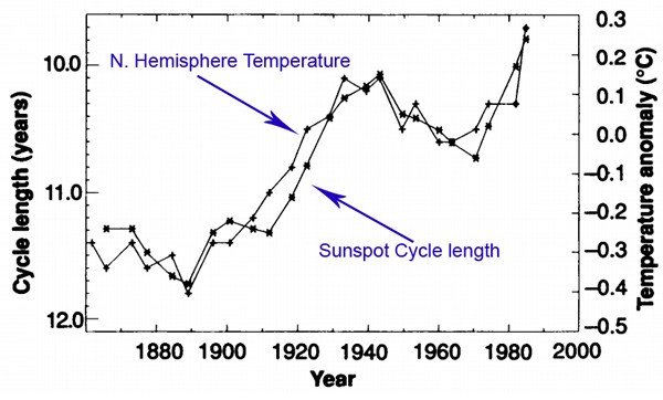 Αλλαγές της ηλιακής δραστηριότητας (κhλίδες) Ένα παράδειγμα των αποδεικτικών στοιχείων ότι, οι αλλαγές της ηλιακής δραστηριότητας ευθύνονται για την αύξηση της θερμοκρασίας του πλανήτη και όχι η επίδραση του ανθρώπου, όπως θέλει η προπαγάνδα των κρατούντων. Η ηλιακή δραστηριότητα, όπως οι ηλιακές κηλίδες, αυξήθηκαν – μειώθηκαν και στη συνέχεια αυξήθηκαν και πάλι κατά περίπου τον ίδιο τρόπο, όπως η θερμοκρασία του πλανήτη. Μια ιδιαίτερα εντυπωσιακή αντιστοιχία βρέθηκε από δύο επιστήμονες, οι οποίοι επικεντρώθηκαν στην διάρκεια του κύκλου των ηλιακών κηλίδων: