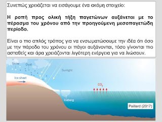 Επειδή η απελευθέρωση του CO2 από τους ωκεανούς του πλανήτη υστερεί σε σχέση με τις αλλαγές της θερμοκρασίας της γης, θα πρέπει να περιμένουμε να δούμε τα παγκόσμια επίπεδα CO2 να συνεχίζουν να αυξάνουν για άλλα οκτακόσια χρόνια μετά το τέλος της τρέχουσας μεσοπαγετωνικής θερμής περιόδου της γης. Θα πρέπει ήδη να είμαστε οκτακόσια χρόνια εντός της επερχόμενης Εποχής των Πάγων πριν τα παγκόσμια επίπεδα CO2 αρχίζουν να μειώνονται σαν αντίδραση στην αύξηση της ψύξης των ωκεανών του κόσμου.