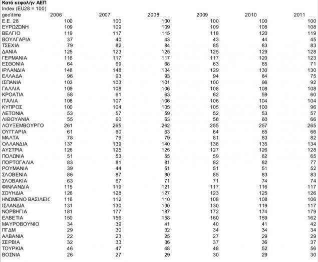 Μπαίνοντας στην κρίση, το κατά κεφαλήν ΑΕΠ των Ελλήνων ήταν 21.845 ευρώ και το 2009 αντιστοιχούσε στο 94% του κοινοτικού μέσου όρου, αντικατοπτρίζοντας τις προσδοκίες που είχαν καλλιεργηθεί στους πολίτες ότι στο τέλος της δεκαετίας θα έπαιρνε σάρκα και οστά η περιβόητη πραγματική σύγκλιση. Λίγα χρόνια αργότερα, οι Έλληνες σε όρους αγοραστικής δύναμης βρίσκονται σε χειρότερη θέση ακόμα και από τις Βαλτικές Χώρες, αυτές του πρώην Ανατολικού Μπλοκ.
