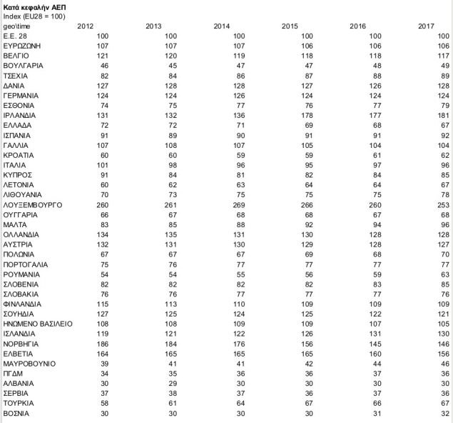 Σύμφωνα με τα στοιχεία της ΕΛΣΤΑΤ, το 2016 υποχώρησε περαιτέρω στα 16.378 ευρώ, ενώ με βάση τη Eurostat το κατά κεφαλήν ΑΕΠ «βούτηξε» το 2017 στο 67% του μέσου όρου της Ευρωπαϊκής Ένωσης.