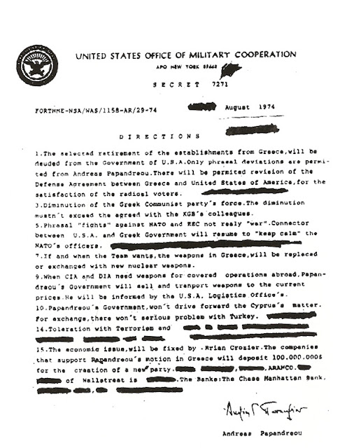 Δείτε το παρακάτω έγγραφο με το οποίο πιστοποιείται ότι ο Ανδρέας Παπανδρέου το 1974 υπέγραψε σύμφωνο με τις ΗΠΑ και τον Rockefeller και τις λεπτομέρειες τη συμφωνίας.