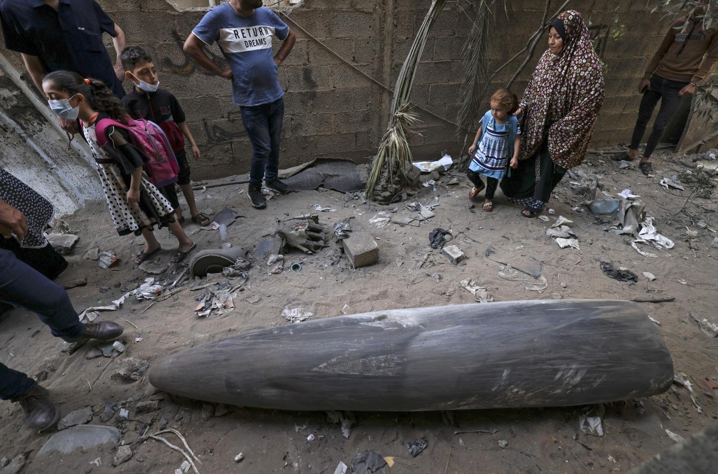 Palestinians look at an unexploded bomb dropped by an Israeli F-16 warplane on Gaza City’s Rimal neighbourhood on 18 May 2021 (AFP/Mahmud Hams)