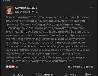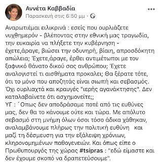 Αναρωτιέμαι ειλικρινά : εσείς που ουρλιάζετε νυχθημερόν – βλέποντας στην εθνική μας τραγωδία, την ευκαιρία να πλήξετε την κυβέρνηση – έχετε,άραγε, βιώσει την οδυνηρή, βίαιη, απροσδόκητη απώλεια; Έχετε,άραγε, έρθει αντιμέτωποι με τον ξαφνικό θάνατο δικού σας ανθρώπου; Έχετε αναλογιστεί τι αισθήματα προκαλει; Θα ξέρατε τότε, ότι το μόνο που αποζητάς είναι σιωπή και σεβασμός. Όχι ουρλιαχτά και κραυγές «ιερής αγανάκτησης». Δεν καταλαβαίνετε ότι ασχημονείτε;;