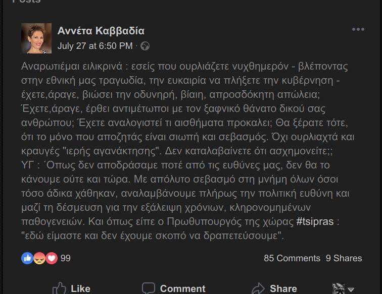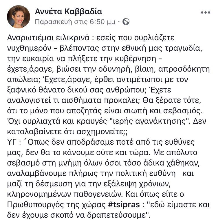 Αναρωτιέμαι ειλικρινά : εσείς που ουρλιάζετε νυχθημερόν – βλέποντας στην εθνική μας τραγωδία, την ευκαιρία να πλήξετε την κυβέρνηση – έχετε,άραγε, βιώσει την οδυνηρή, βίαιη, απροσδόκητη απώλεια; Έχετε,άραγε, έρθει αντιμέτωποι με τον ξαφνικό θάνατο δικού σας ανθρώπου; Έχετε αναλογιστεί τι αισθήματα προκαλει; Θα ξέρατε τότε, ότι το μόνο που αποζητάς είναι σιωπή και σεβασμός. Όχι ουρλιαχτά και κραυγές «ιερής αγανάκτησης». Δεν καταλαβαίνετε ότι ασχημονείτε;;