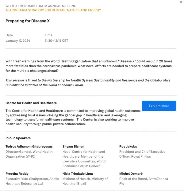 Το WEF σίγουρα συμβάλλει στη διαφημιστική εκστρατεία γύρω από αυτήν την υποθετική ασθένεια. Την Τετάρτη υπάρχει μια ολόκληρη σύνοδος στην ετήσια συνάντηση του WEF με τίτλο «Προετοιμασία για τη νόσο Χ» και η περιγραφή αυτής της συνόδου δηλώνει δυσοίωνα ότι «Ασθένεια…