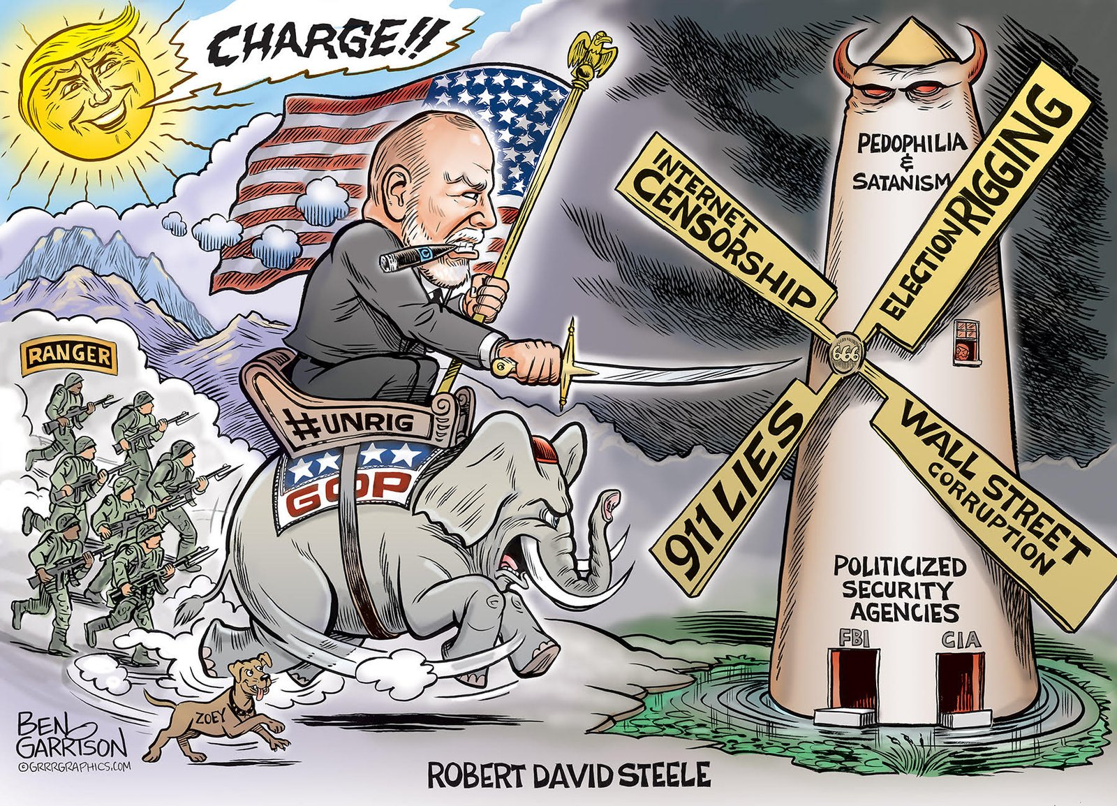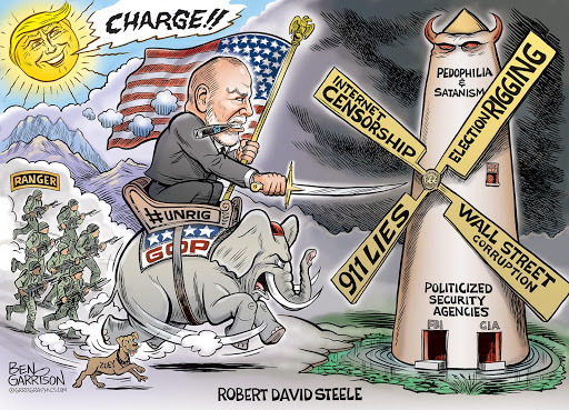 She provided the artist with some ideas, he kindly asked me what I thought was important, and out of this came his original creation. I was stunned by his ability to capture in one image everything I despise and seek to reform. He envisioned me as a “Don Quixote” but unlike Don Quixote, he sees me surfing the Trump/GOP wave, backed up by the National Security Agency (NSA) database holding all the evidence we need to eradicate traitors, elite pedophiles, and both white and black collar criminals.