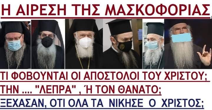 2 χρόνια ΦΑΡΣΑΣ-19 με πρώτο έτος απατεωνιάς, το 2020, όταν δεν πέθαινε κανείς, η αιρετική Ορθόδοξη εκκλησία συνεργαζόταν με την χούντα του Γουρλομάτη για να επιβάλλουν το ψέμα και υποχρέωση της μάσκας, ώστε δόλια και ύπουλα να εμβολιάσουν τους Ελληνες και να τους δολοφονήσουν μαζικά!!!