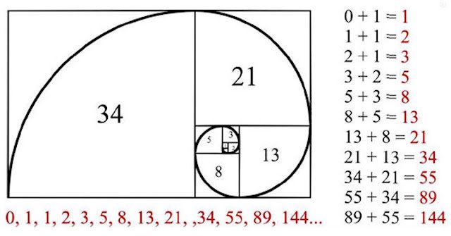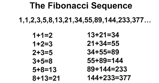 Για παράδειγμα, προσθέτουμε το 0 και το 1 το οποίο μας βγάζει 1 που είναι ο τρίτος αριθμός Φιμπονάτσι. Για να βρούμε τον τέταρτο πρέπει να προσθέσουμε το 1 και το 1 που βγάζει 2. Και αν συνεχίσουμε προσθέτοντας τα δύο τελευταία ψηφία παίρνουμε τους αριθμούς 3,5,8,13,21,34,55,89,144 κτλ.- ένα μοτίβο που μπορεί να συνεχίζεται για πάντα.