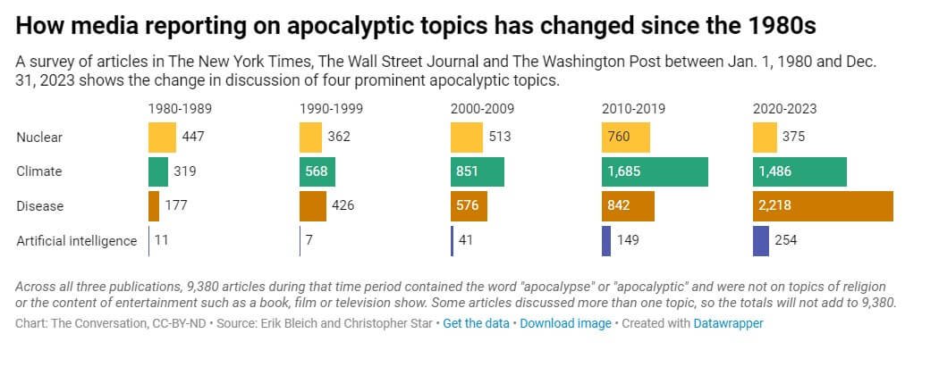 Ακολουθώντας αυτή τη λογική, συγκεντρώσαμε όλα τα άρθρα που ανέφεραν τις λέξεις «αποκάλυψη» ή «αποκαλυπτική» από τους New York Times, τη Wall Street Journal και την Washington Post μεταξύ 1ης Ιανουαρίου 1980 και 31 Δεκεμβρίου 2023. Μετά το φιλτράρισμα για άρθρα θρησκείας και ψυχαγωγίας, υπήρχαν 9.380 άρθρα που ανέφεραν ένα ή περισσότερα από τέσσερα σημαντικά αποκαλυπτικά ζητήματα: πυρηνικός πόλεμος, ασθένειες, κλιματική αλλαγή και τεχνητή νοημοσύνη.
